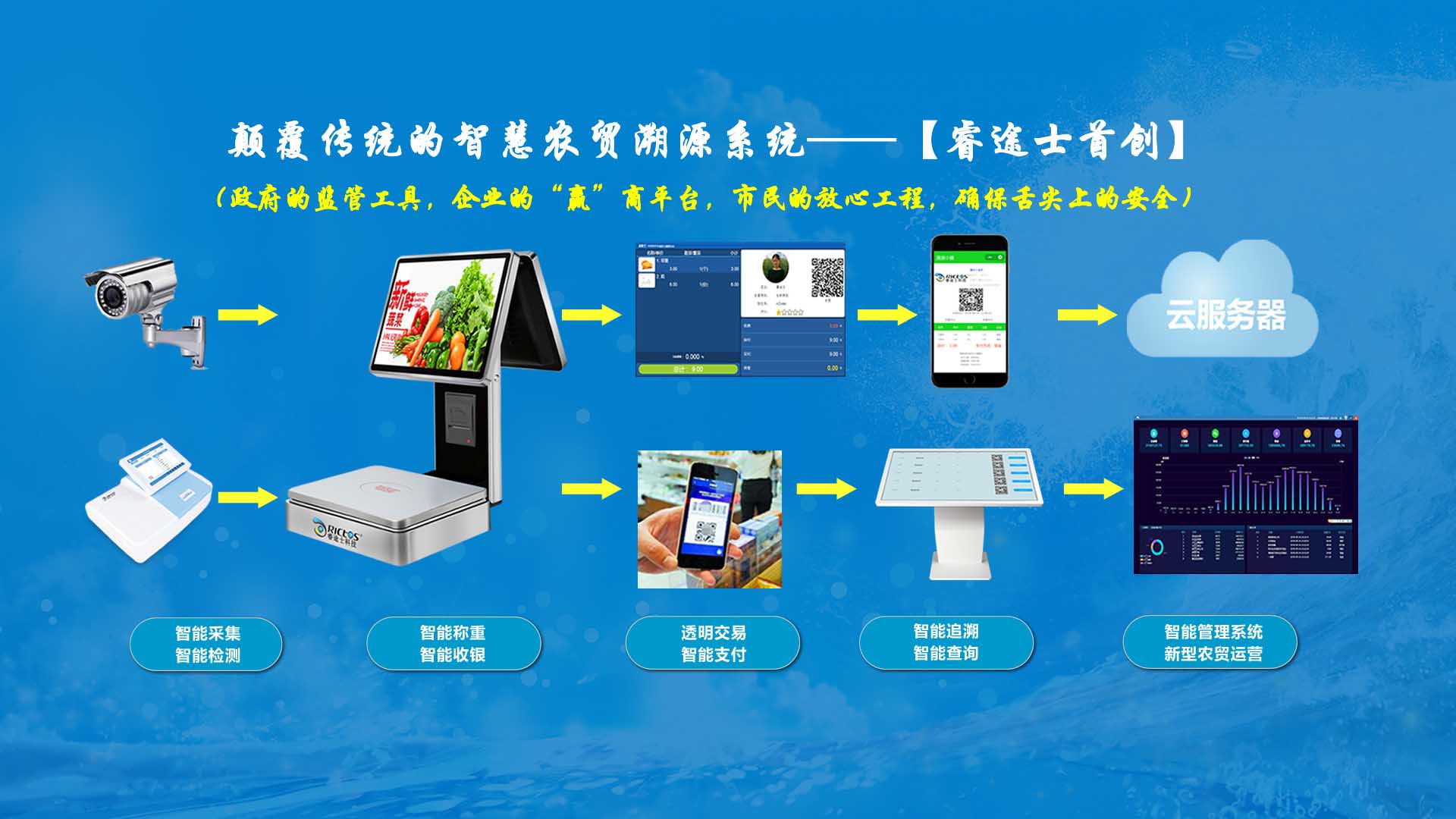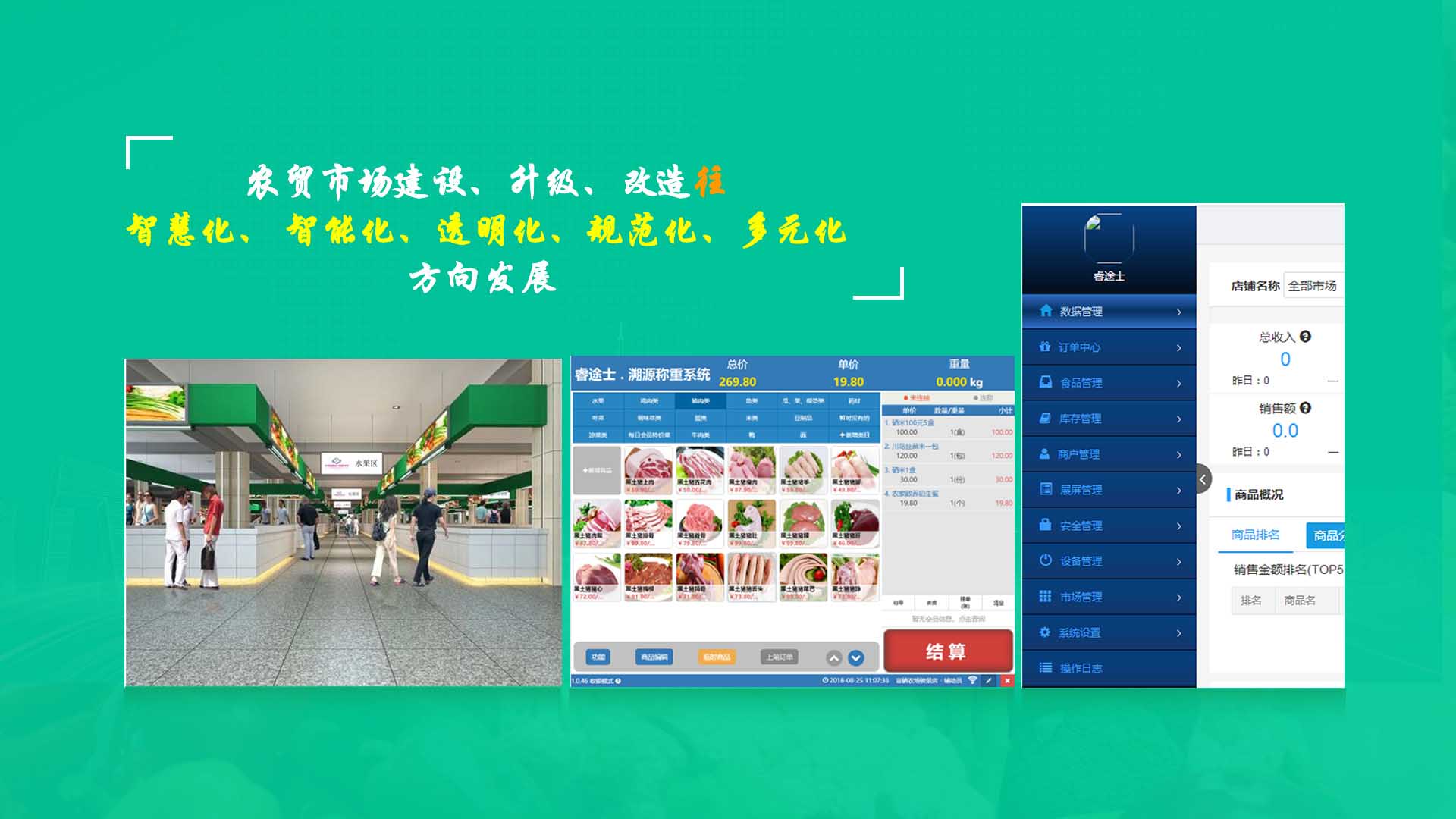 創(chuàng)新實現(xiàn)了【智慧農(nóng)貿(mào)溯源管理系統(tǒng)】與【智能稱重收銀】一體化解決方案,集市場管理、運營管理、溯源追溯、智能收銀大數(shù)據(jù)運用于一體,硬件、軟件與管理系統(tǒng)完美結(jié)合。適用于農(nóng)批、農(nóng)貿(mào)市場蔬菜、生鮮、水果、水產(chǎn)、肉類、熟食等稱重和非稱重銷售;由于采用一體化設(shè)計,解決了傳統(tǒng)農(nóng)貿(mào)市場無法實現(xiàn)的信息化、智能化、可追溯的管理問題;使稱重、收銀、追溯、管理、更透明、公正、安全,讓顧客無后顧之憂,給管理工作帶來極大的便捷與高效,對國內(nèi)農(nóng)產(chǎn)品行業(yè)的發(fā)展、農(nóng)產(chǎn)品流通管理起到了典范作用。 【睿途士首創(chuàng)】顛覆傳統(tǒng)的“智慧農(nóng)貿(mào)市場系統(tǒng)”,解決了傳統(tǒng)農(nóng)貿(mào)系統(tǒng)單一安卓掛屏,昂視不方便看、不直觀、無互動性,傳輸信息不齊全、不穩(wěn)定的問題,也解決了按鍵電子秤商品難找、商品代碼難記、按鍵操作不靈活、支付不智能,對收銀管理、銷售商品、菜名、菜價、打折、優(yōu)惠、會員、線上下單、采購等無法實現(xiàn)實際菜品交易和追溯等問題。 更具顛覆性的是睿途士智慧系統(tǒng)擁有三大管理平臺(市場管理平臺、總部運營管理平臺、商戶后臺管理平臺)、一個可視操作前臺和三大追溯功能,讓遠程管理、數(shù)據(jù)傳輸、人機互動、智能控制、移動支付、大數(shù)據(jù)、互聯(lián)通信、云端存儲、人工智能、智能城市、電子定位、智能收銀等功能得以實現(xiàn)。